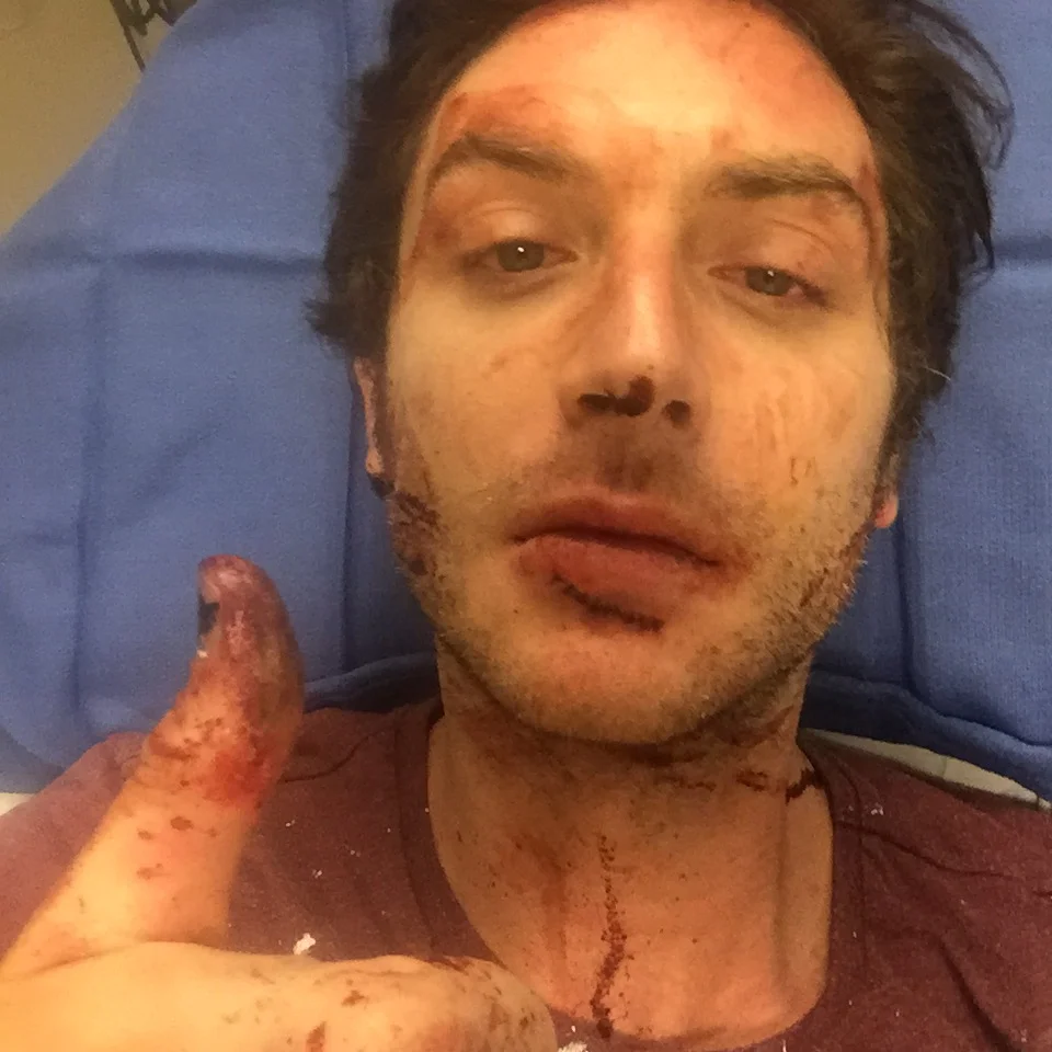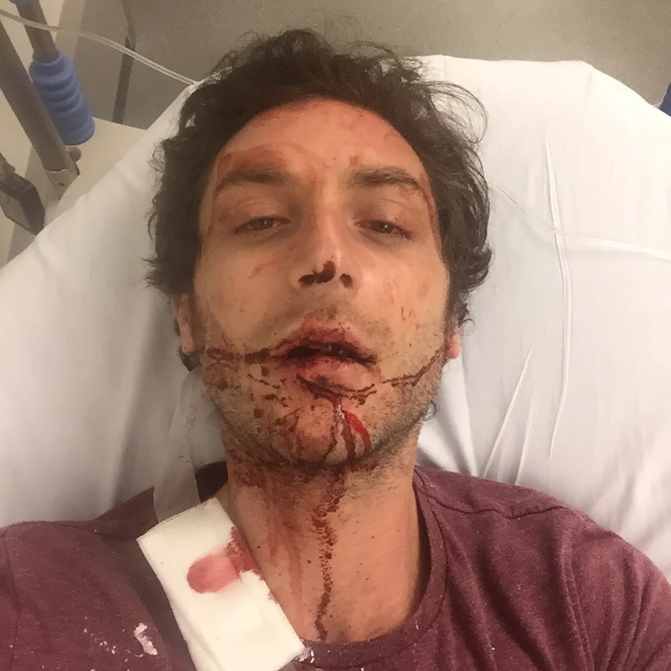 This was me exactly a year ago. I was in the emergency room after a sleeping walking accident, which had me face plant into a marble shelf. I was in the worst pain of my life with two shattered teeth, and laceration on my lip that required 17 stitches. Best of all, the grand opening of the KnowNoTruth gallery was happening the following day.